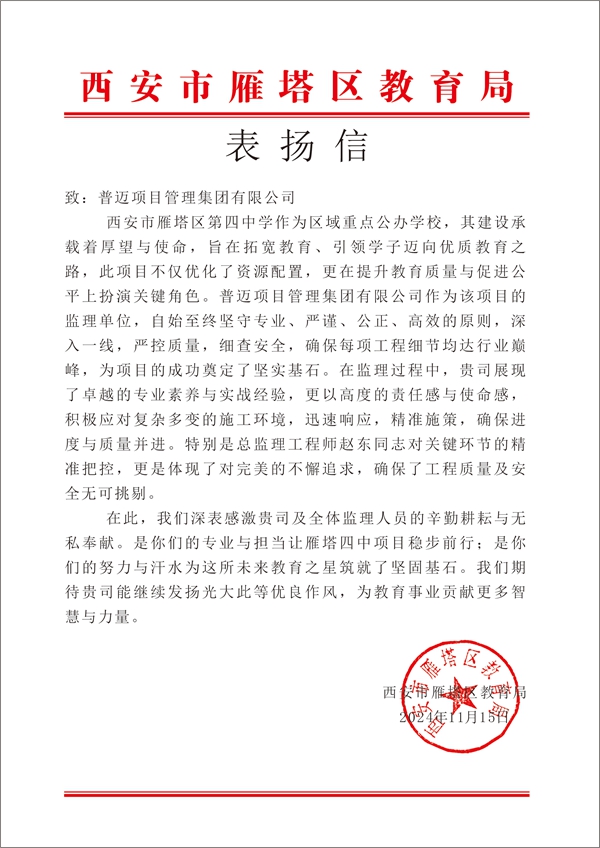 2024年11月15日,滚球官网收到一封来自西安市雁塔区教育局的表扬信,表扬信对西安市雁塔区第四中学建设工程的监理服务工作质量予以充分肯定和认可!该项目由我滚球官网第十五事业部承监,信中还特别对滚球官网及总监理工程师赵东带领的项目监理服务团队提出了感谢和表扬!