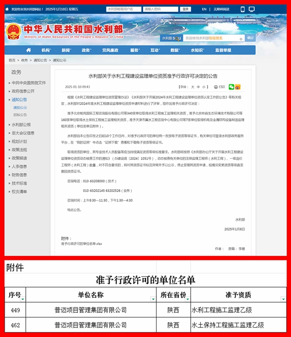 2025年1月8日,滚球官网资质申报工作传来喜讯,经中华人民共和国水利部核准,滚球官网喜获水利工程施工监理乙级、水土保持工程施工监理乙级两项资质!