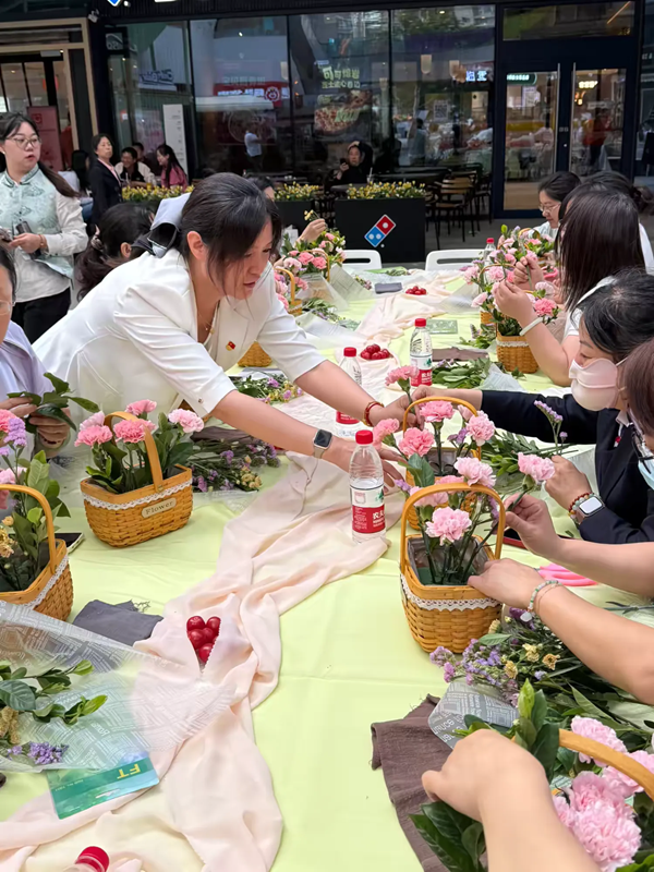在专业花艺师的现场指导下,大家精心挑选康乃馨、玫瑰、满天星等花材,修枝剪叶,构思配色,让枝叶芬芳被巧手赋予新的生命,让爱与感恩在指尖肆意流淌。以花为礼、以爱之名,致敬所有伟大的母亲。