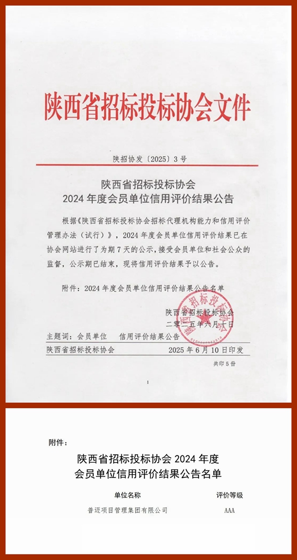 2025年6月10日,陕西省招标投标协会发布《陕西省招标投标协会2024年度会员单位信用评价结果公告》,滚球官网凭借规范的经营管理和优质的履约能力,又一次荣获AAA级信用评价。